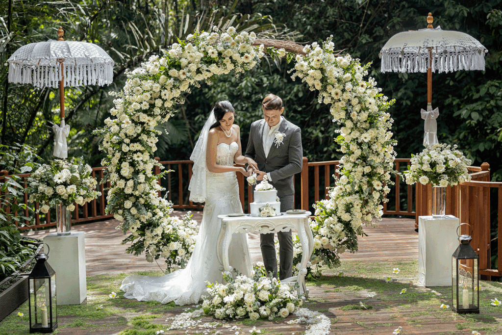 - Tropical decoration with 1 ring arch, 2 beautiful standing flowers beside the altar, 1 flower center piece on the table, 2 white Balinese umbrellas, 1 basket flower shower, long white flowers, decorated welcome sign board, and 2 white tiffany chairs